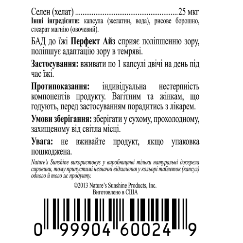 БАД к пище Перфект Айз НСП является дополнительным источником витаминов (Е, А, В2, В6), бета-каротина, лютеина, цинка, меди, хрома, селена, таурина, кверцетина, содержит глутатион, антоцианы.